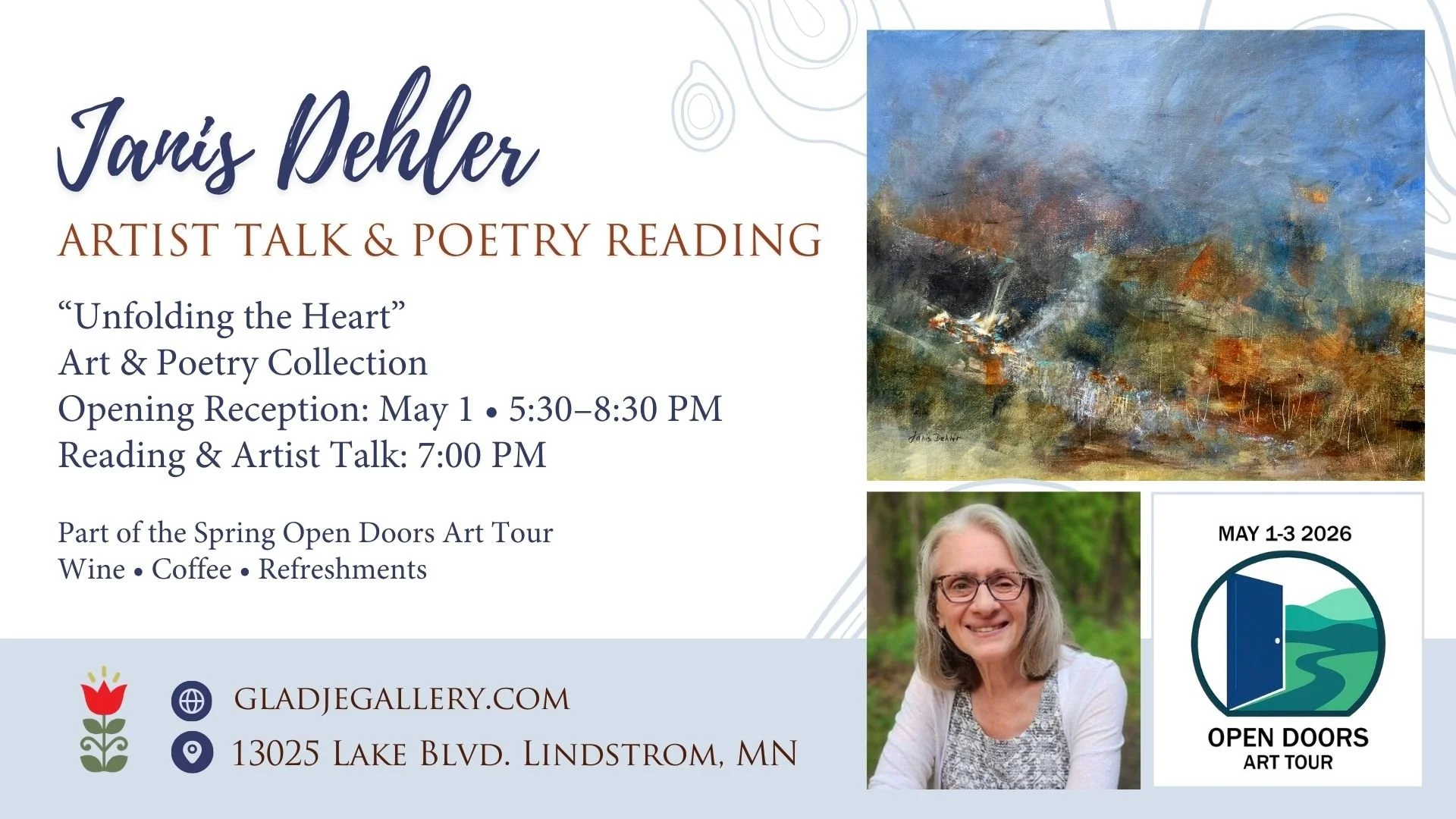 During the Open Doors Art Tour, we are proud to feature painter and poet Janis Dehler as our April–May Featured Artist. Join us for her opening reception on May 1 from 5:30 - 8:30pm, with her artist talk at 7:00 — all are welcome, and refreshments will be served.